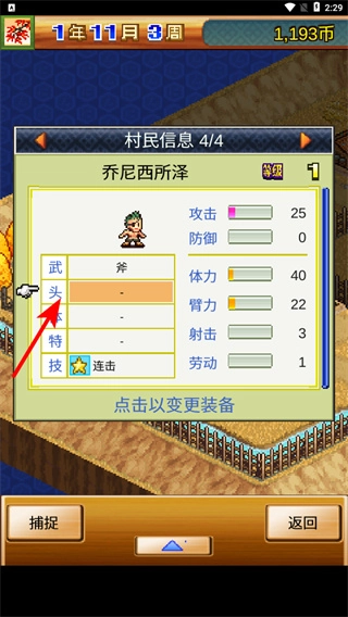 4、在村民信息界面,点击武头等装备栏可变更装备,为村民配备合适的武器装备,提升其攻击、防御等属性,助力劳动。
