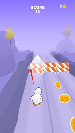 2、游戏的玩法其实很简单,就是经典的跑酷玩法,通过上下左右滑动屏幕控制鸭子跑酷,比如遇到这种障碍物就向下滑动;