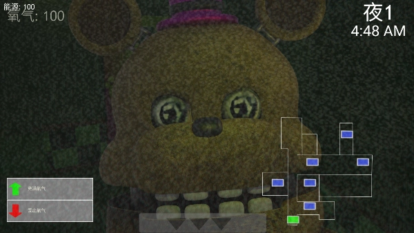 3、切换至摄像头视角,点击右下角的蓝色方块,即可改变摄像头的监视范围。当看到面包熊出现时,要保持安静,仔细观察它所在的位置。随后,再次点击下方的三角图标,把视线转回房间。