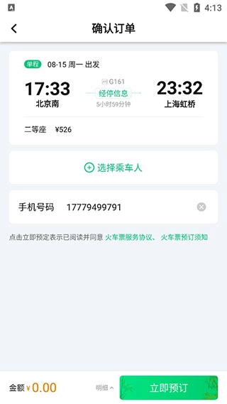 4、进入班次详情页点击预定,添加本人或家人乘车信息后完成支付;