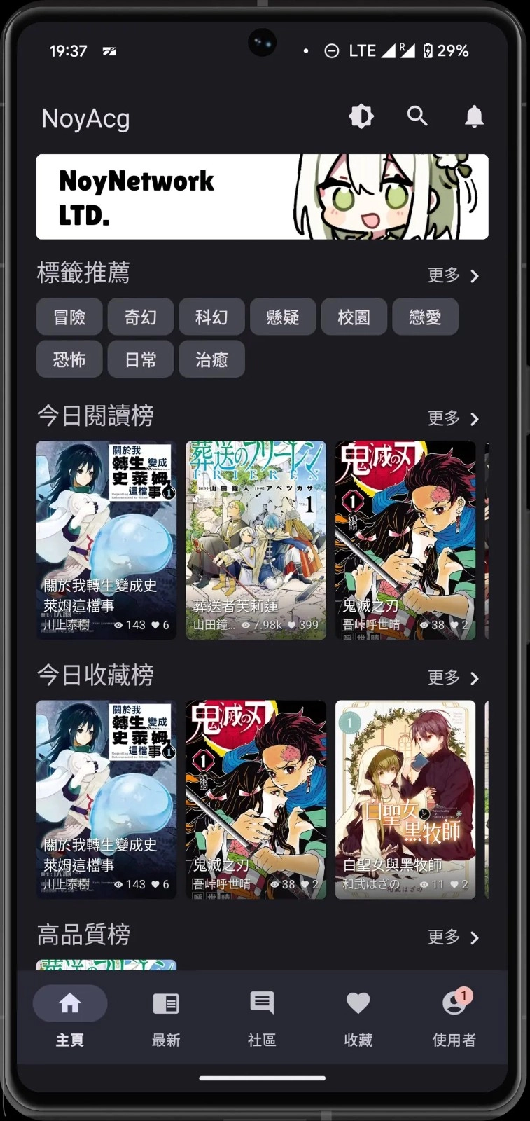 noyacg漫画是一款十分出色的漫画阅读平台,各类漫画资源都集中在这个软件里,能让你快速开启漫画阅读与浏览之旅,无论是国内还是国外的漫画作品,在这里都能找到。平台每天都会更新最新的漫画资源,让你可以轻松畅快地阅读漫画内容。各种类型的漫画作品这里应有尽有,让你尽情享受追漫的乐趣。而且它支持高清画质一键切换,帮助用户快速打发时间,带来更优质的追漫体验。这是无聊时光里必备的追漫软件,分类十分齐全,各类漫画作品也在不断更新,感兴趣的用户可千万别错过这款软件!