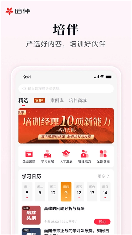 培伴App聚焦培训行业的八大细分领域,涵盖培训管理、人才发展、内训师、人力资源、职场提升、团队管理、组织管理及业务能力,旨在满足用户系统化学习的需求,同时着重优化用户在在线学习、优质内容检索以及资源匹配等功能上的使用体验。