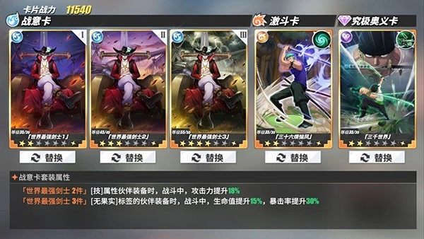 战意卡,每个人物可以带三张,品质由低到高分为绿、蓝、紫、橙。品质越高,加的属性和战力也就越高!战意卡可以升级和突破,等级越高,属性和战力越高,升级需要的材料也比较多,大家前期可以用蓝色战意卡过渡升级,以后换下来的蓝色战意卡可以直接吃掉,不会损失太多。战意卡佩戴优先带自己响应的属性(力技心),其次战意卡两件套和三件套都有属性加成。战意卡主要产出无尽、勇者和商店兑换,前期可以提升人物好感度,可以给蓝色滴用用。最后35级之后,且战意卡升至3星时,就可以洗练了,洗练也分为低中高洗练,橙色洗练是最高滴,材料也最为难得,主要就是海岛争霸活动产出,洗练提升的战力非常乐观,所以大家加油打海岛。