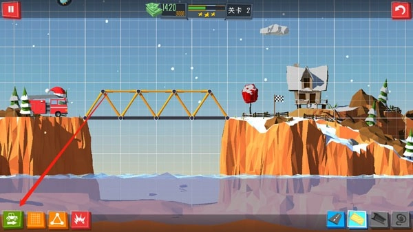 4、搭建好桥之后,点击左下方的开车按钮,即可完成通关,我们要做的就是争取花最少的圆子完成桥梁建造