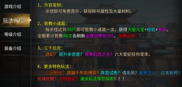 每击杀怪物数量累积到88只,就能进行一次管教小诸葛的操作,从而获取丰厚的元宝、经验以及书页奖励。