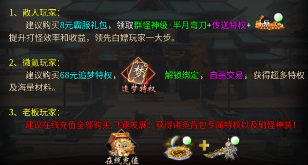 建议入手8元的霸服礼包,里面包含群怪神技·半月弯刀、传送特权以及超强吸血称号。有了这些,打怪的效率和收益能比白嫖玩家高出不少,直接领先一大截。