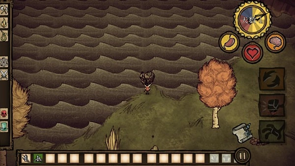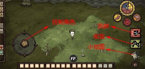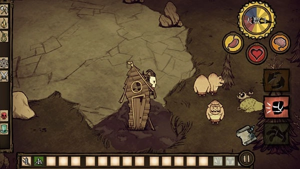 5、游戏随即正式启动,左侧的按键用于操控角色的移动方向,右侧的按键则负责资源收集功能,玩家需要尽可能搜集所有可利用的资源,以此来帮助角色抵御饥荒的威胁。