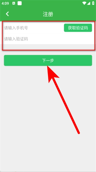 输入手机号码,点击“获取验证码”按钮,待收到验证码后输入,接着点击“下一步”,即可完成注册流程。