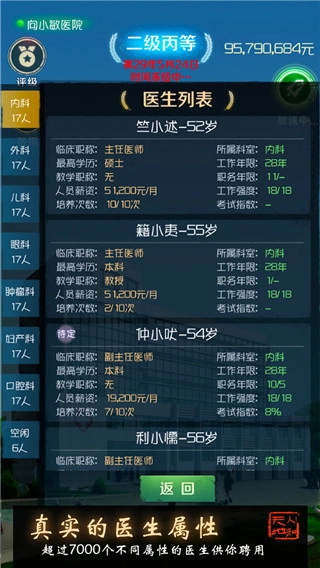 游戏内的医生均需通过招聘获取,不同医生具备各异的学历背景,而学历会对医生通过临床职称考试的概率产生影响。