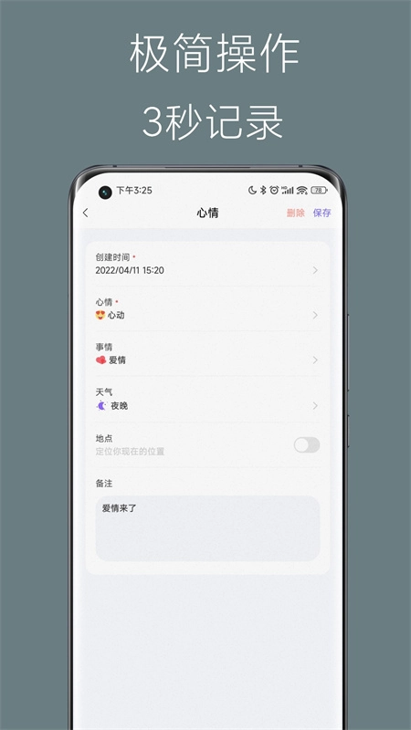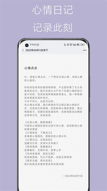 1、【三步速记,操作极简】 超简单的操作流程,仅需3秒就能轻松完成心情记录 2、【情绪记录,拥抱真实】 萌趣心情图标伴你记录多样心情,探寻影响情绪的深层原因