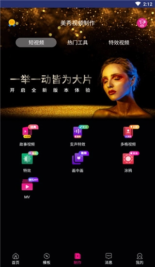 3、首页也有大量短视频可供浏览; 4、借助软件自带的视频模板,能一键生成同款视频; 美秀视频制作的优势: 1、专业的视频剪辑功能,操作便捷且效果专业; 2、精美的音乐相册,搭配唯美风格的音乐; 3、丰富的电影滤镜特效,拥有多种炫彩电影风格滤镜。