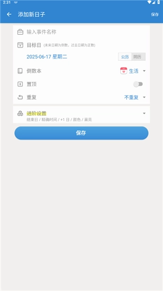1、打开首页后,点击右上角的“添加新日子”按钮,你可以选择像生日、高考这样的重要时间节点,并将其设置为对应的具体日期和时间。