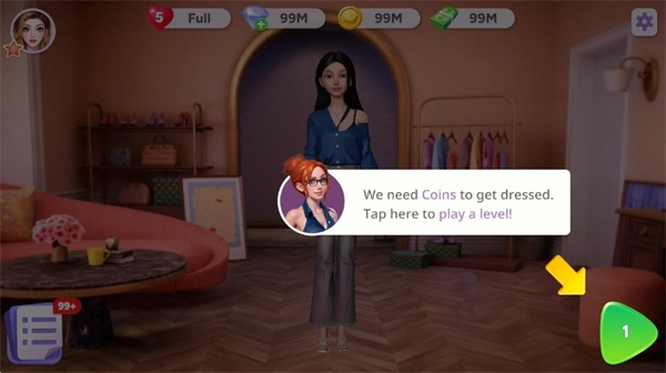 进入游戏后,点击绿色按钮进入关卡,通过消除关卡获取金币等资源,用于时尚装扮。