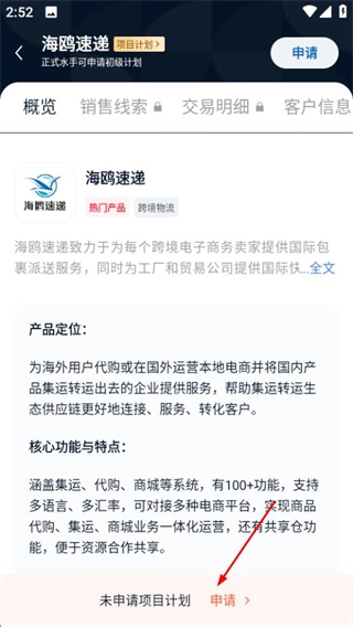 在产品详情页面,点击底部的申请选项,就能申请该项目计划。