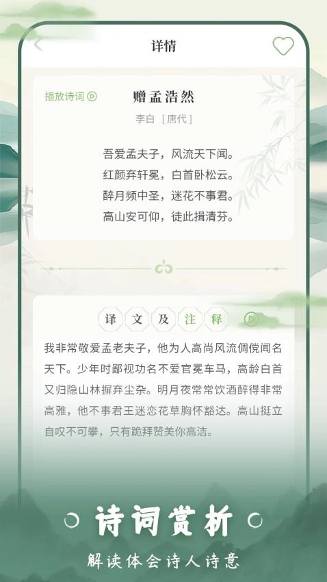3、平台为所有诗文配备了准确可靠的翻译及注释内容,助力用户精准把握诗歌的内涵与创作背景,进而深入领略其中蕴含的情感与意境。