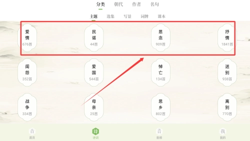 4、依据主题类型对诗歌开展精细化分类工作,涵盖送别、爱情、战争、思乡、爱国等十多个类别,助力用户更具针对性地挑选和研习相关内容。