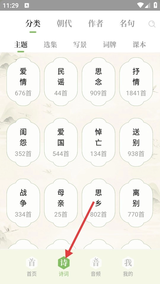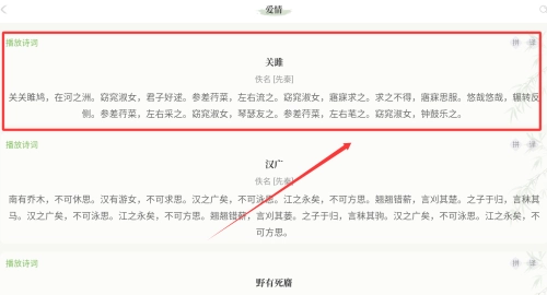 2、点击【诗词】,可按分类浏览诗词,如爱情、民谣、思念等主题诗词。