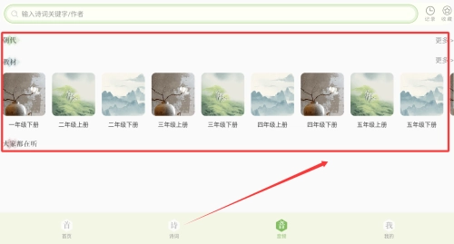 1、进入【首页】,可在搜索框输入诗词关键字或作者,查找相关诗词,也能直接播放展示的诗词。
