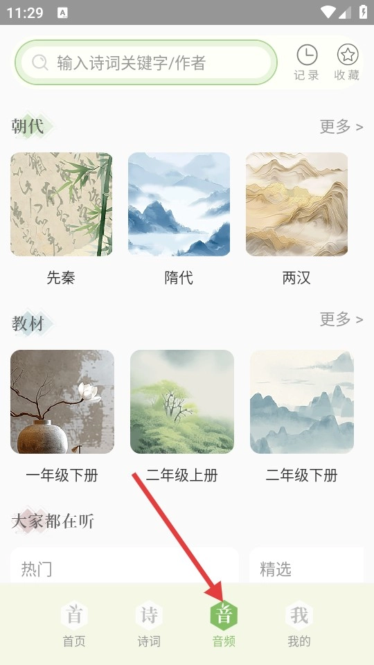 3、切换到【音频】,可选择不同朝代或教材相关的诗词音频进行收听。