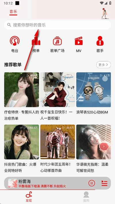 1、打开悦动音乐,进入首页点击页面上方的输入栏