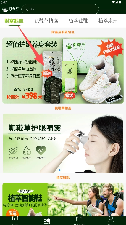 首页设置了财富起航版块,能直接展示养身鞋品和护理用品等核心物品,让信息获取既直观又高效。