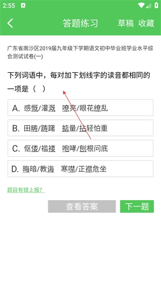 进入答题练习页面后完成题目作答,点击【下一题】即可继续练习。