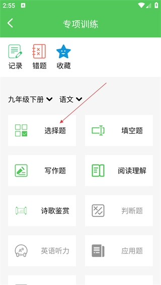 在专项训练页面,选择对应的年级、学科和题型,比如九年级下册语文的【选择题】这类选项。