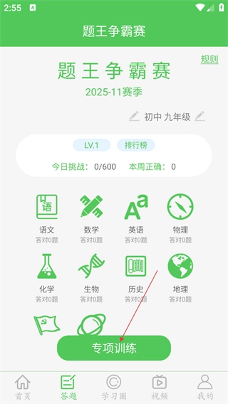 在题王争霸赛页面,点击【专项训练】选项,即可进入专项训练页面。