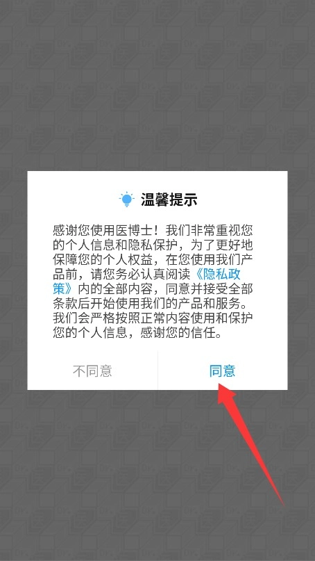 首次使用时,请仔细阅读用户服务协议和隐私政策,确认无误后点击同意选项,即可进入应用。