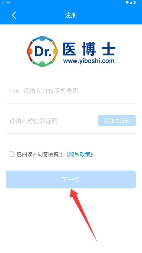 在注册页面输入手机号码以获取验证码,勾选同意相关条款后,点击“下一步”按钮继续后续操作。