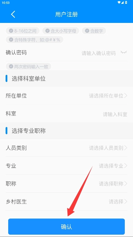 完善个人资料涵盖设置密码、选定所属科室与职称等信息,确认无误后即可完成账号注册。