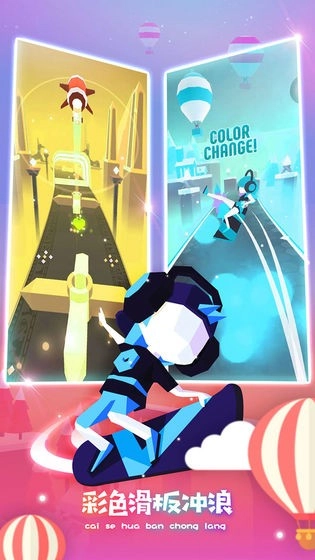 创新色彩匹配机制,巧妙结合传统跑酷与色彩解谜元素,玩家需操控滑板角色撞击同色障碍物以积累分数,打造别具一格的色彩冲浪感受。