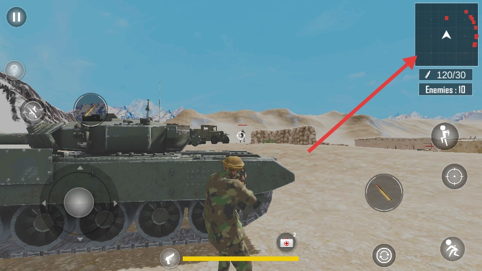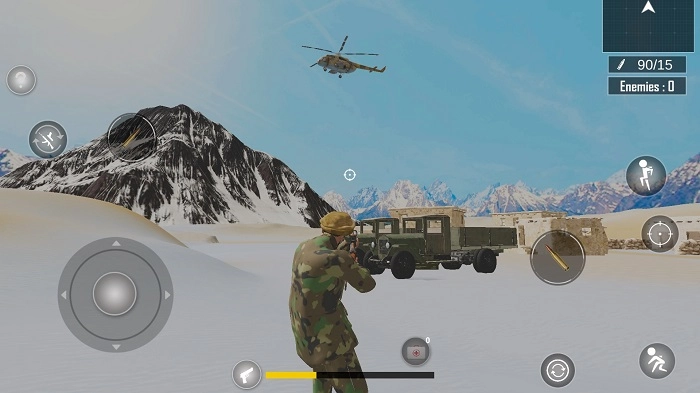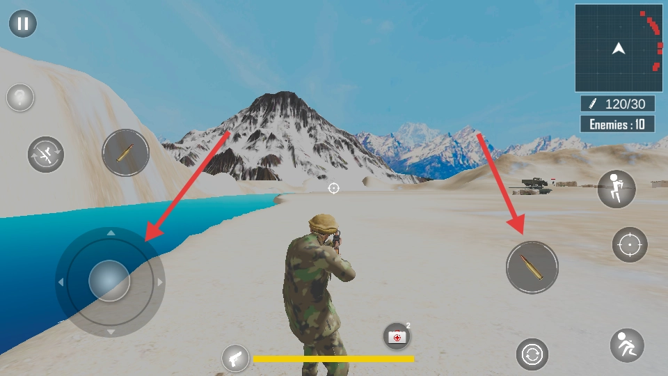 角色的移动由虚拟摇杆操控,射击视角则通过滑动屏幕来调整。