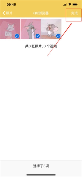 打开手机相册,把要打包压缩的照片都勾选上,选完点“完成”按钮。