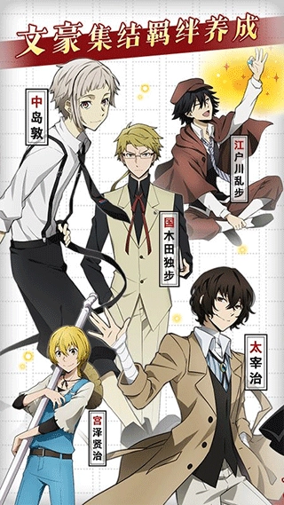 《文豪迷犬怪奇谭》日服获得《文豪野犬》正版授权,完美还原动漫里的经典角色与场景。玩家可以自由收集心仪人物,组建由羁绊养成打造的强力队伍,投身精彩战斗——探索重重迷雾,释放月下兽、罗生门等炫酷异能,完成各类任务与挑战,体验别具一格的精彩剧情。