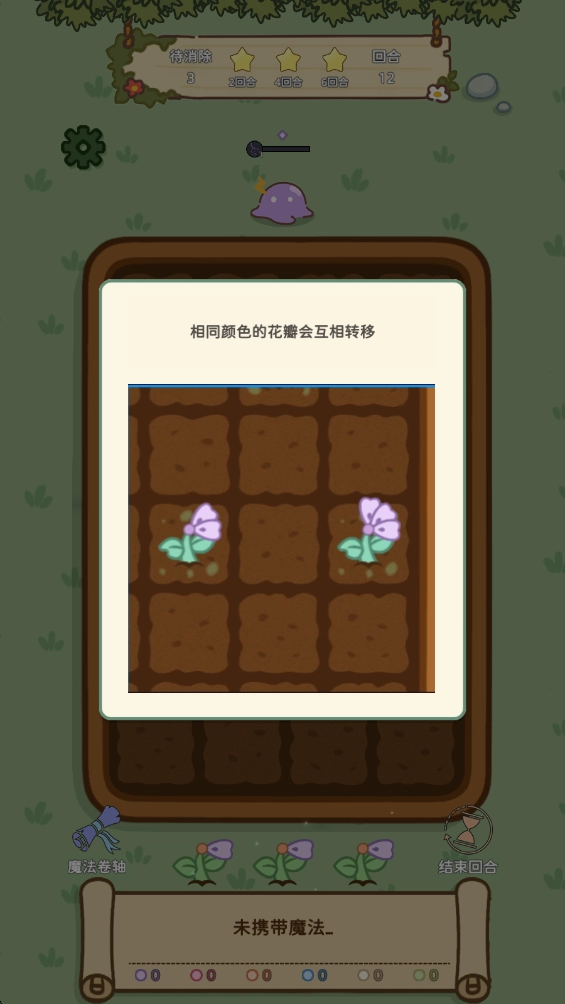 魔法花匠创造了一个被黑暗魔物侵蚀的奇幻花园世界,玩家要借助魔法力量对抗腐化。游戏里,每一关的土地上都散落着花瓣不全的“坏花”,玩家得通过移动和拼接,把相同颜色花朵的花瓣数量补完整,让它们绽放并消除。随着关卡的深入,魔会持续干扰修复过程,玩家则能解锁多种魔法技能,依靠策略性的回合规划来守护花园的平静。