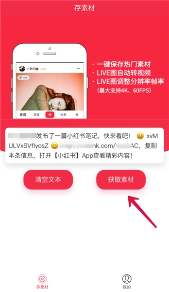 把复制好的链接粘贴到对应的输入框里,然后点击“获取素材”按钮