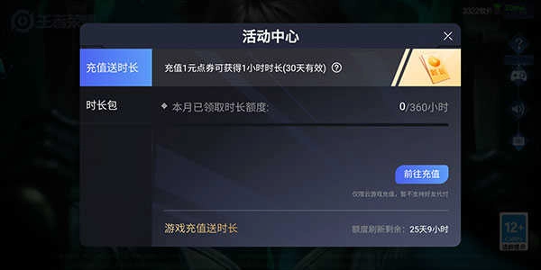 在腾讯先锋(云王者)中,每充值1元人民币的点券就能获赠1小时游戏时长,通过这种方式每月获赠的时长上限为360小时。常言说“充钱一时爽,一直充钱一直爽”,理论上只要资金充足就能持续兑换时长,但这种做法并不推荐,除非你确实有足够富余的资金。