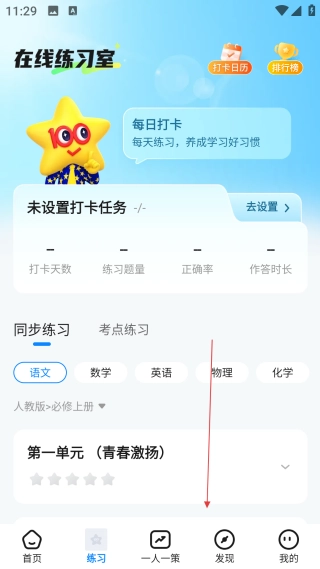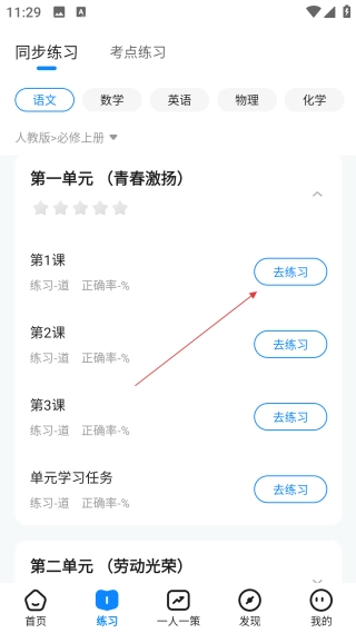 在单元里选好课程后,点击【去练习】按钮就能开启相应内容的练习了。