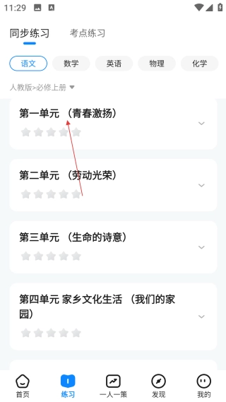 在练习界面,向下【滑动屏幕】进入练习单元界面。