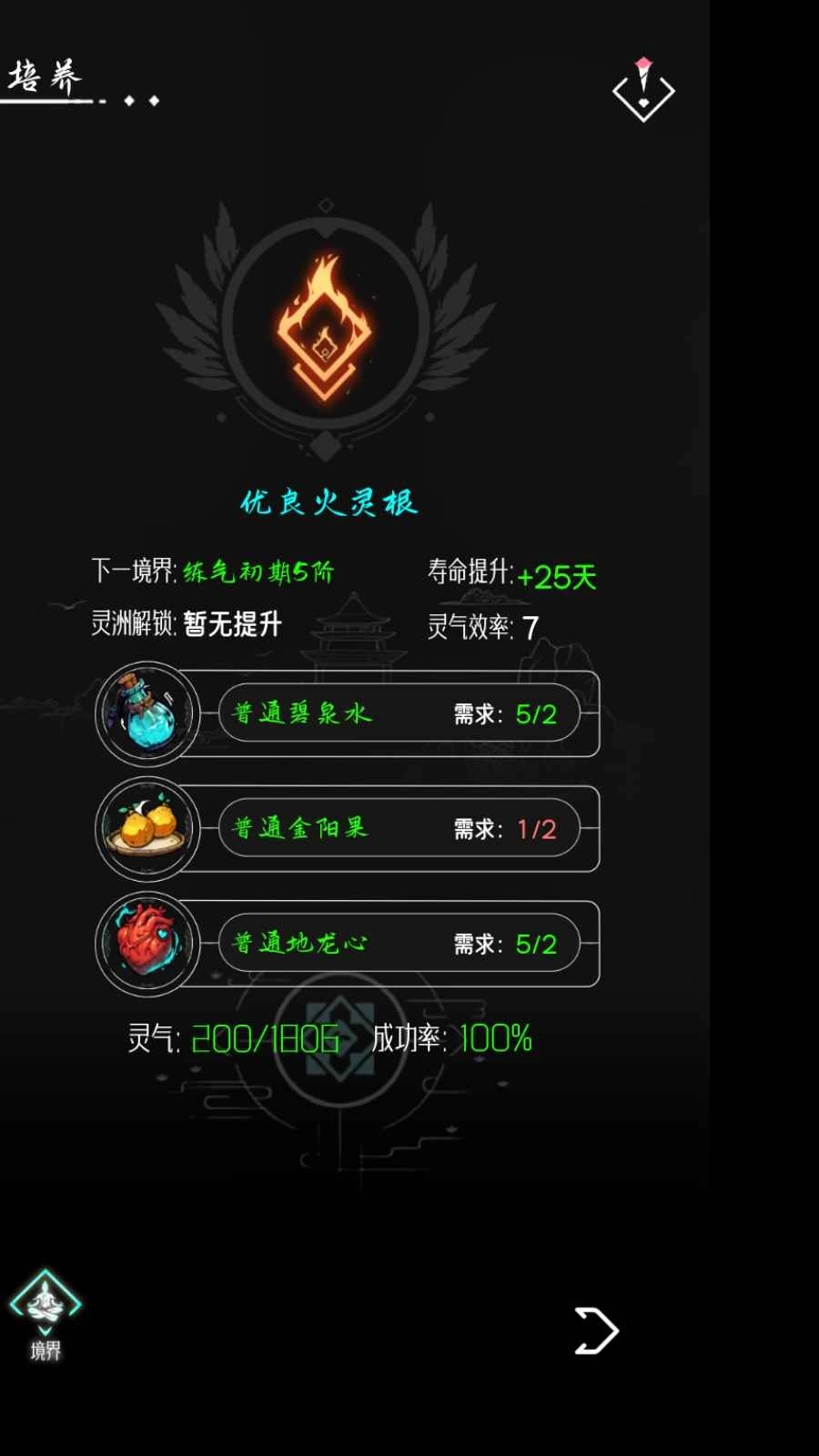 筑机丹没办法靠垂钓获取,垂钓仅能得到晋升所需的材料;开辟灵州后可以挂机,从中收获丹药和灵材。只要寿命没有耗尽,你就能持续突破,直至登上最高境界。当前垂钓点只能通过每日刷新以及挂机来获取,建议增添更多玩法,比如让修为提升战斗力,增加降妖除魔获取灵材的途径,设置一些随机事件——像突破途中有所感悟而连升几级,或是突破失败导致跌落大境界等。整体来看,这款游戏的可塑性还是相当高的。