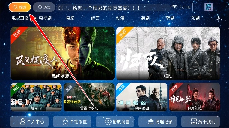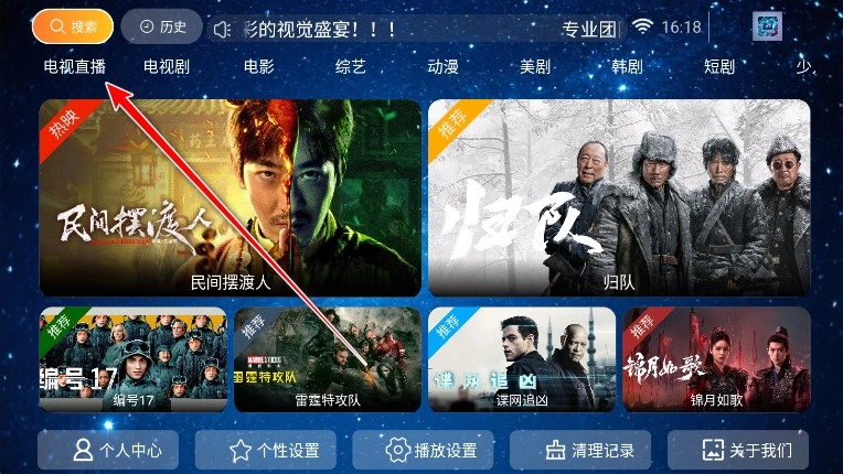 1、首先在本站找到繁花影视tv盒子并打开,进入软件后,我们能看到首页上方有不少板块内容