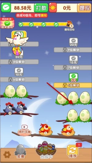 4、特定等级的小鸟还会提供直接提现的机会,比如在这里合成出4级小鸟,就直接提现了0.24。