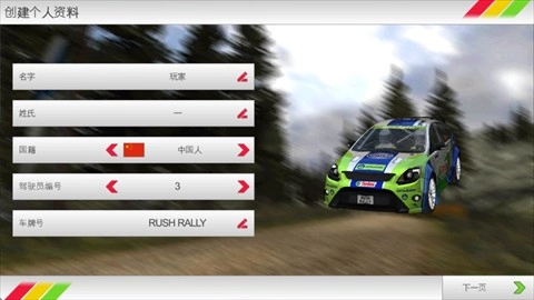 1、启动拉力竞速3游戏,创建游戏角色,角色创建完成后,点击“下一页”按钮继续操作。