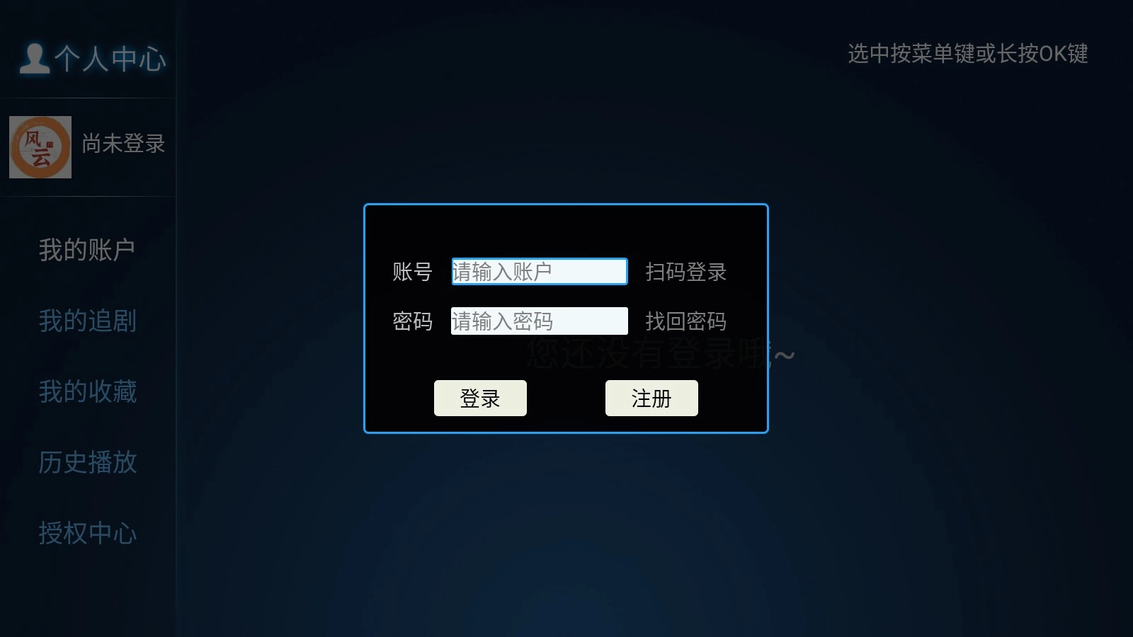 3.返回首页点击个人中心,App提示需要注册,安札要求进行注册