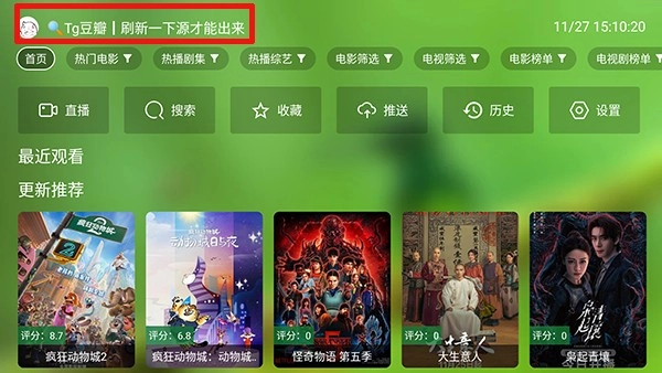 1、回到首页,点击左上角的影视源,刷新一下页面就能显示内容了。