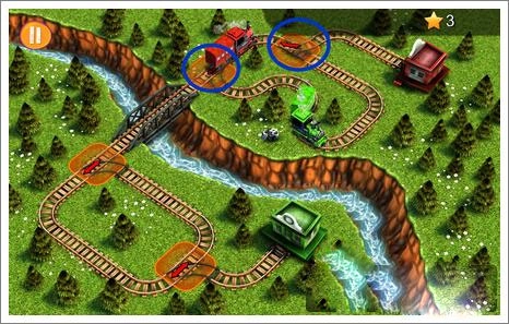 游戏启动后,点击两个蓝色圆圈的位置,指引两辆火车各自进入空闲区域,待时机合适时再开展后续操作。