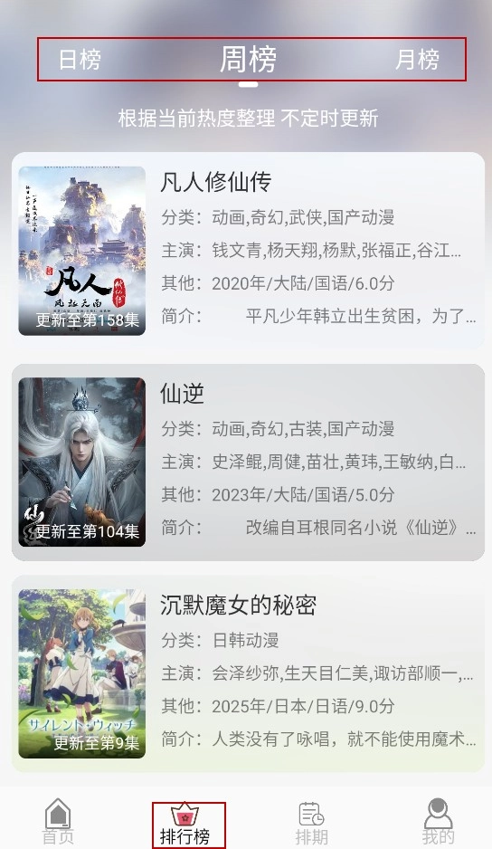 安装并打开u7Fun动漫后,在排行榜页面能够看到三种动漫榜单。