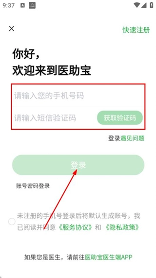 在登录界面输入手机号与验证码,勾选相关协议后,点击登录按钮即可完成账号登录流程。