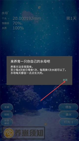 先查看养崽须知的提示,里面会说明养育水母要做到至少每4天喂一次食、每周换一次水,之后点击关闭按钮把提示框关掉,就能开启水母的养育操作了。